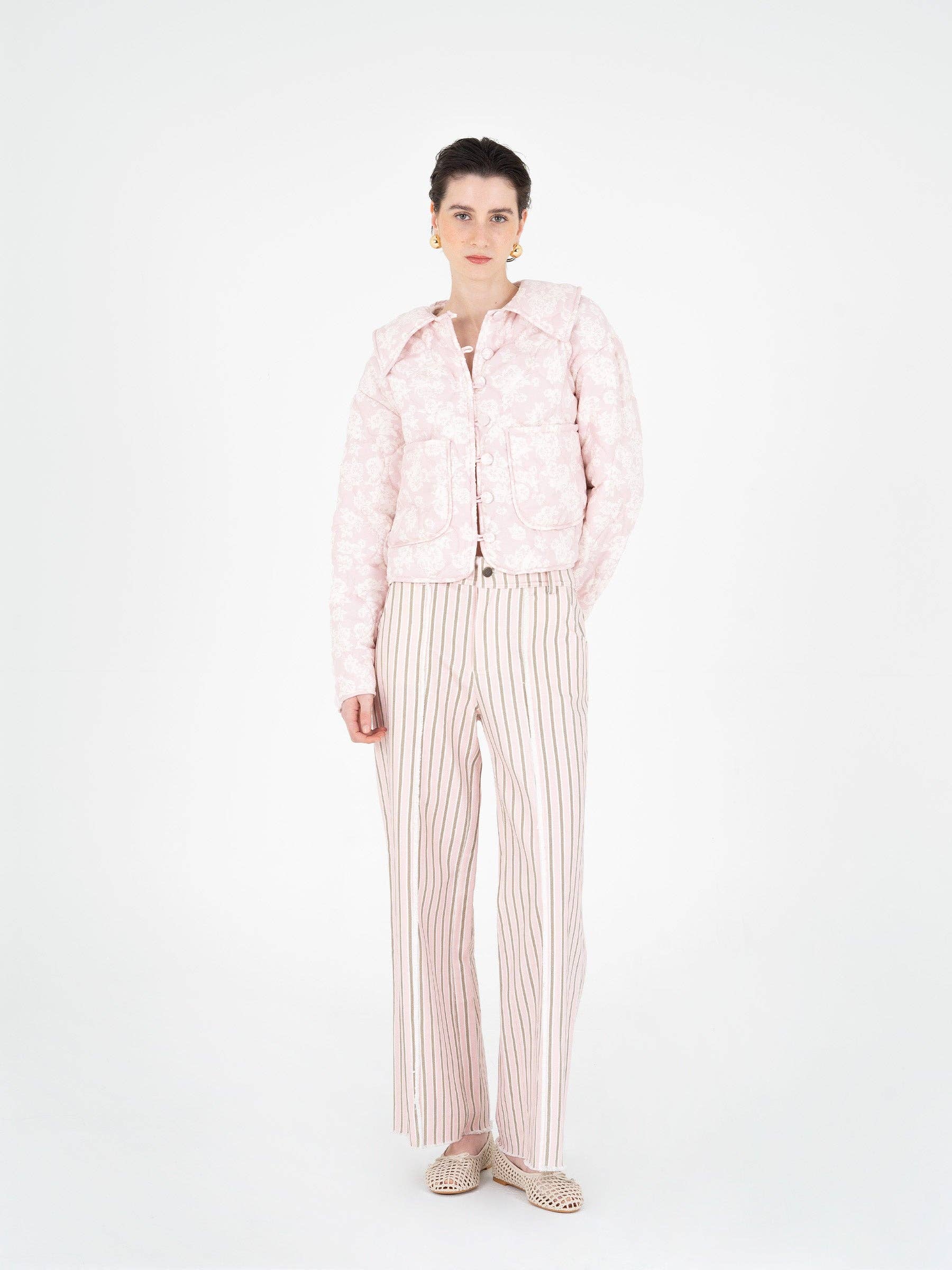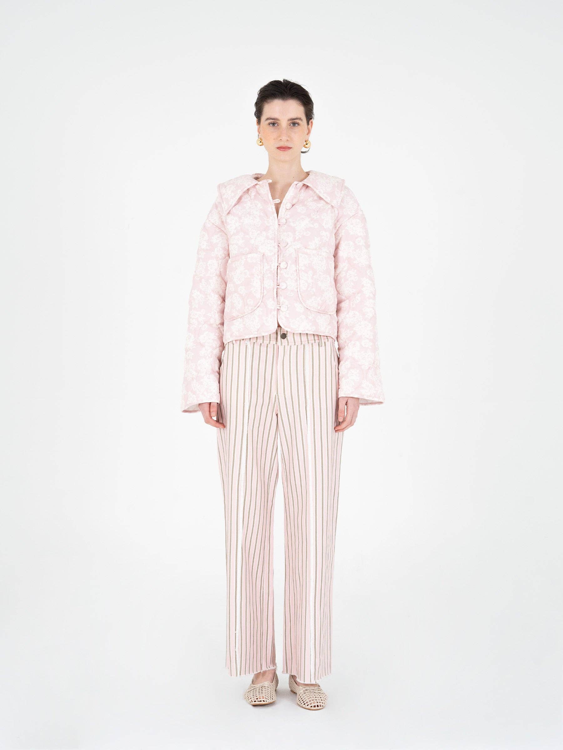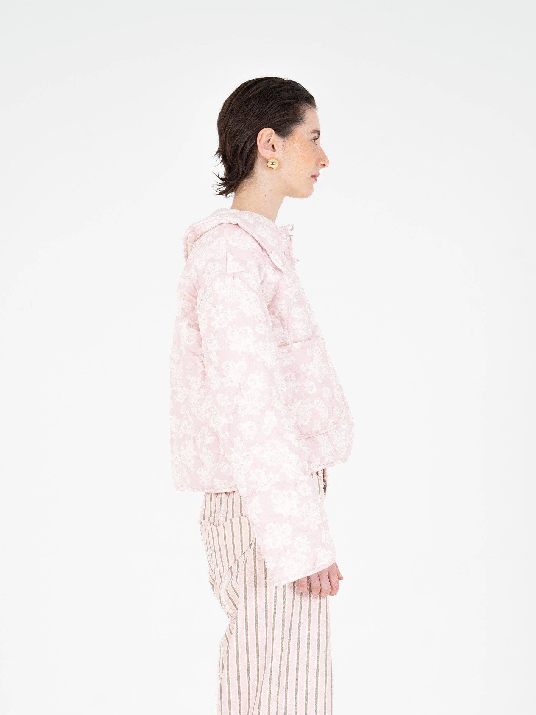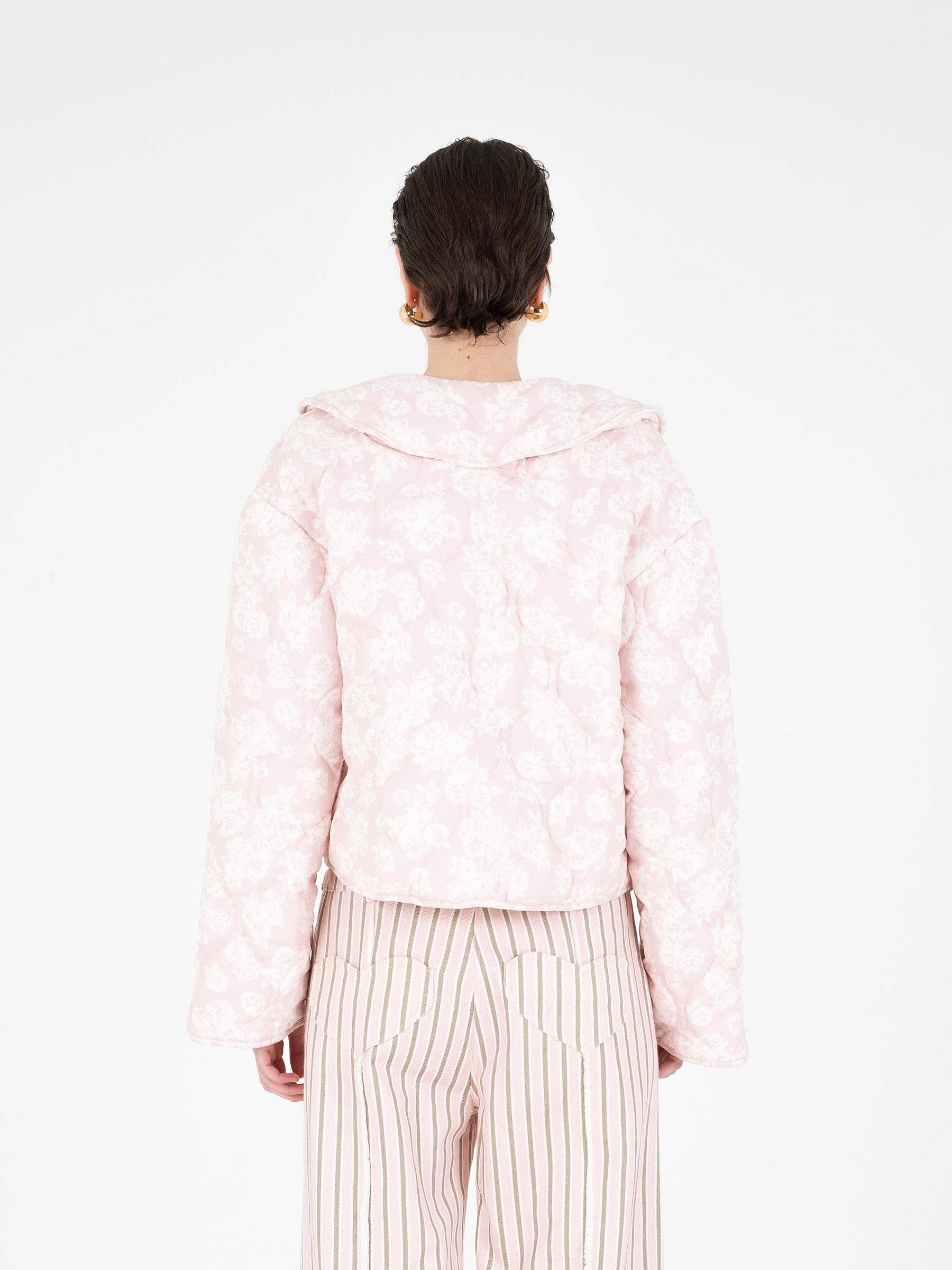 Printed quilted jacket, slightly oversized. Straight cut and shirt-style collar. Pockets with piping detail on the front. Front closure with buttons and loop detail in the same fabric.