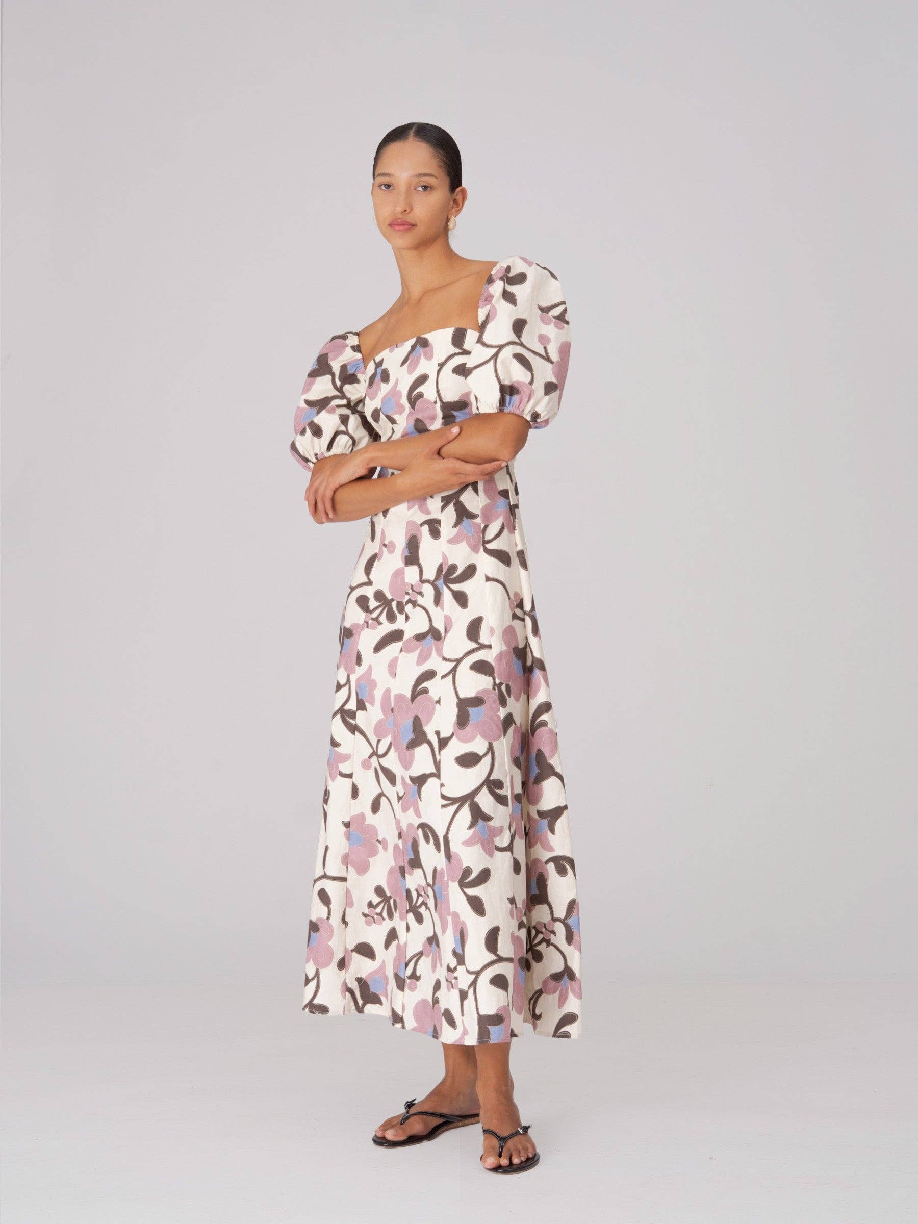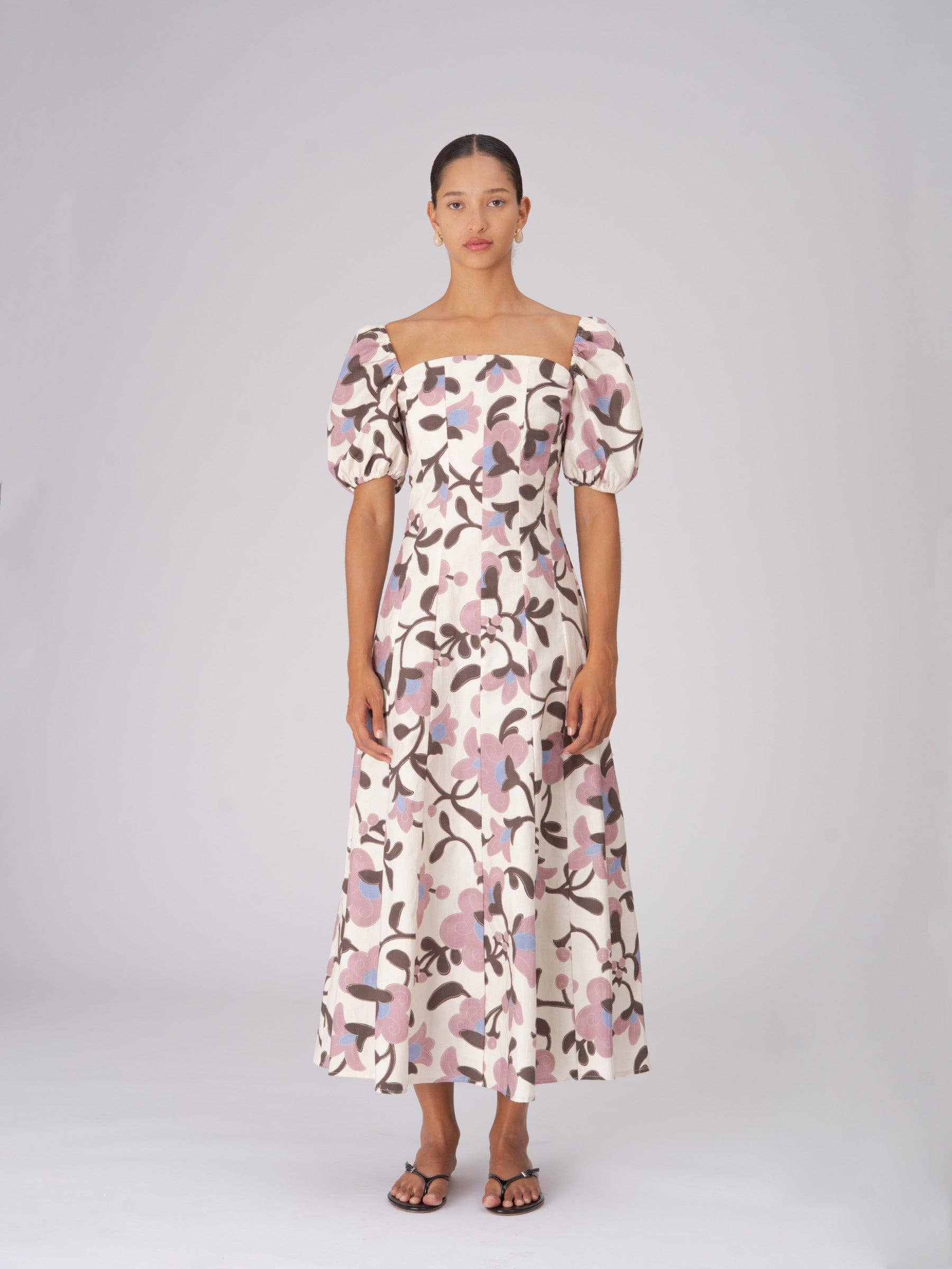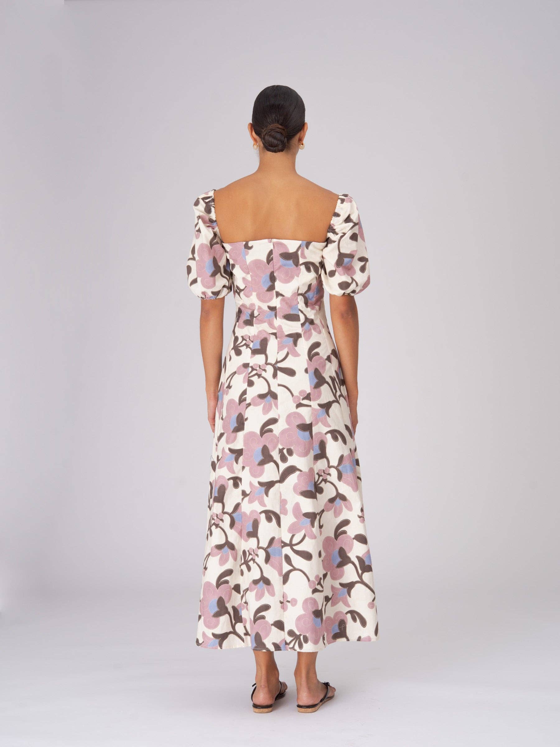 Vestido largo con estampado floral. Escote cuadrado y mangas abullonadas. Diseño con cortes tipo corsé. Cierre con cremallera invisible en la parte trasera. Perfecto para ocasiones especiales.