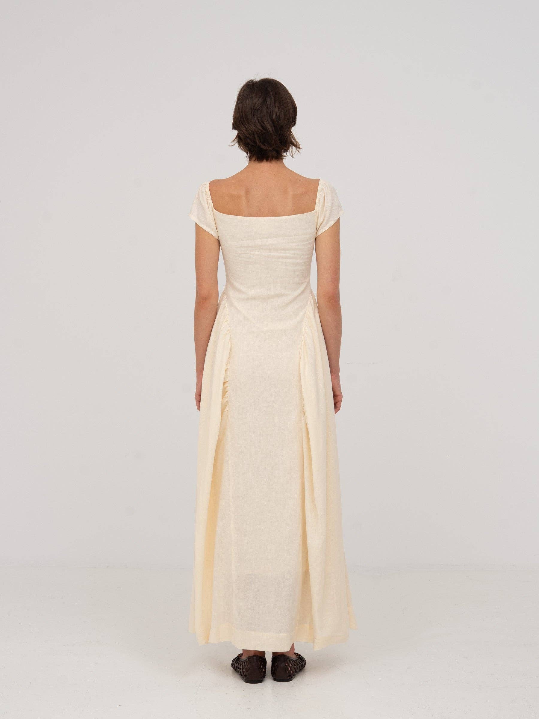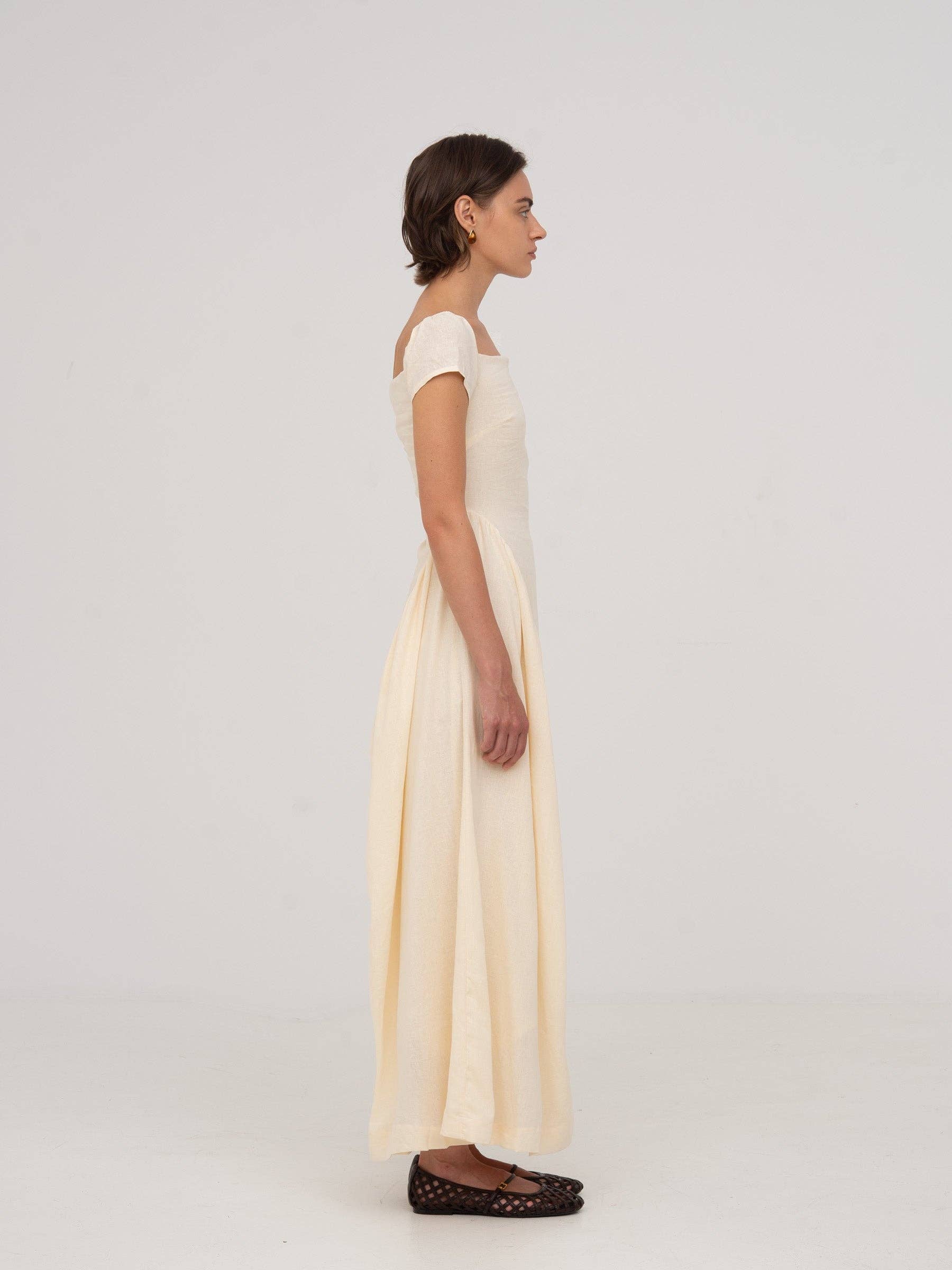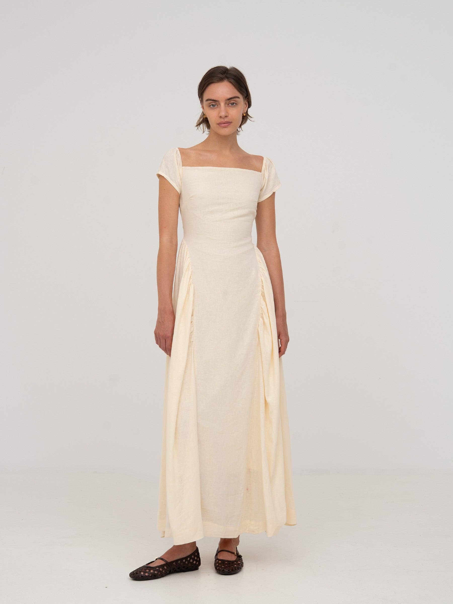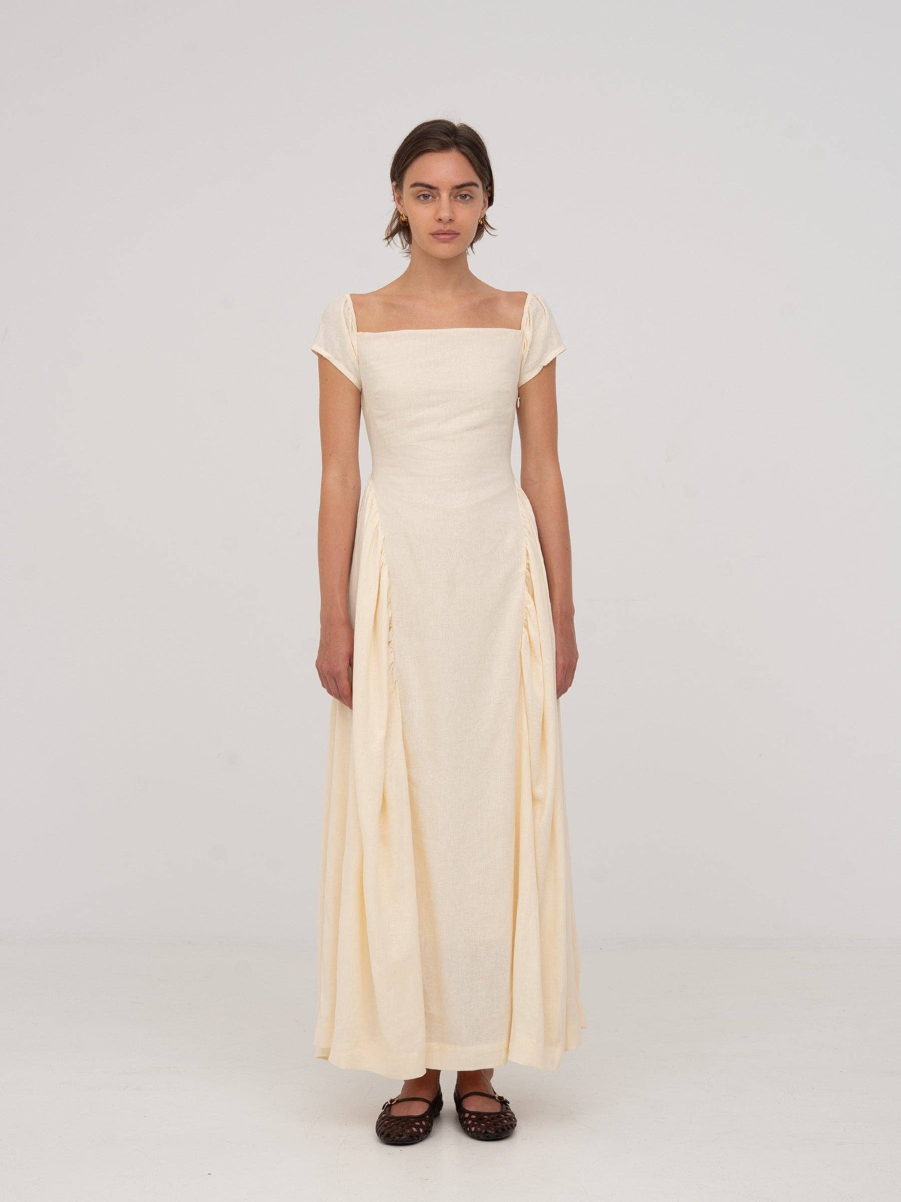 Vestido largo en tono beige. Diseño con escote recto tipo barco que deja los hombros al descubierto. Torso entallado con mangas cortas y cortes en cadera con pliegues sutiles que aportan volumen. Cierre lateral con cremallera invisible.