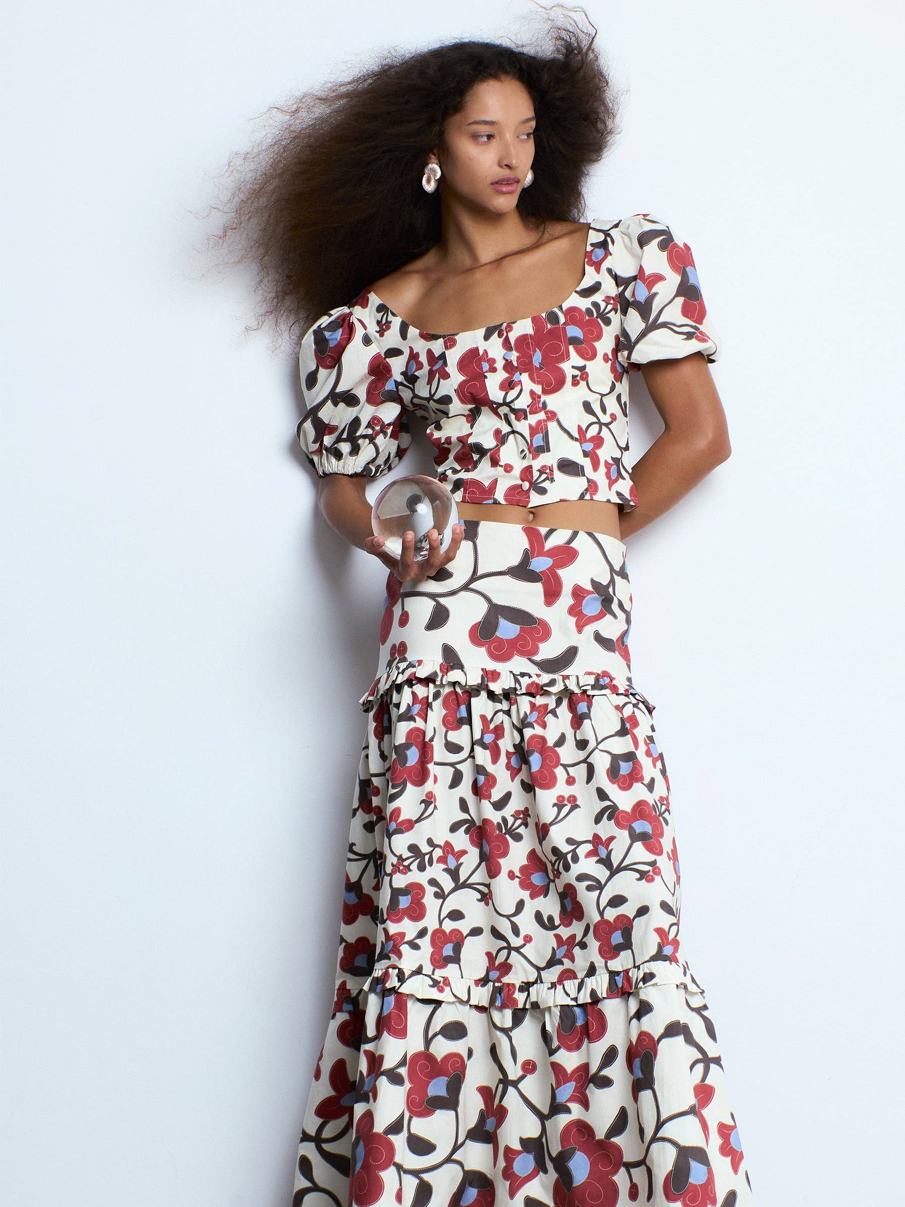Floral print top with puff sleeves. Cropped cut with corset-style details. Square neckline. Button fastening at the front. Perfect for special occasions.