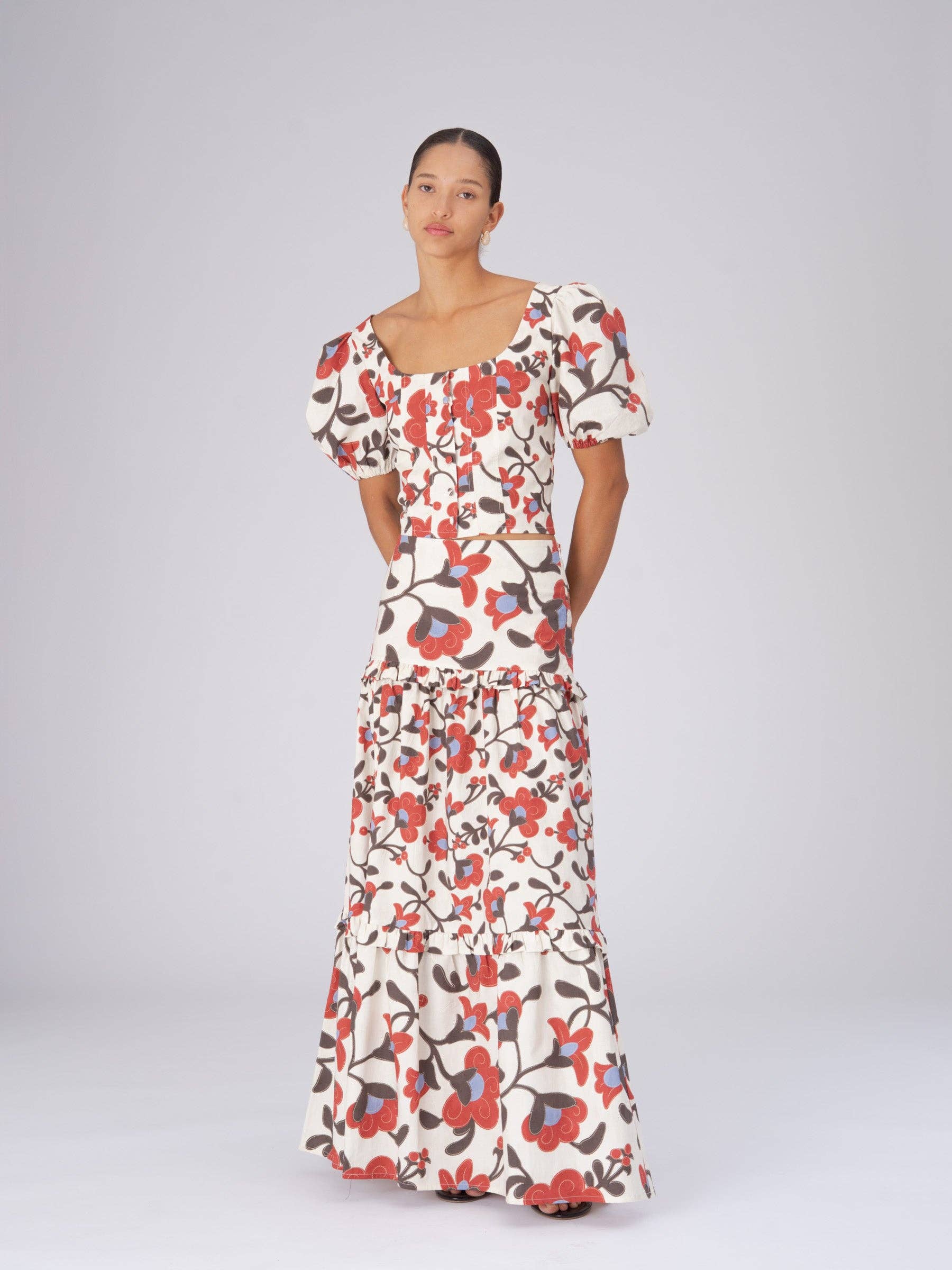 Top con estampado floral y mangas abullonadas. Corte cropped con detalles tipo corsé. Escote cuadrado. Cierre con botones en la parte frontal. Perfecto para ocasiones especiales.